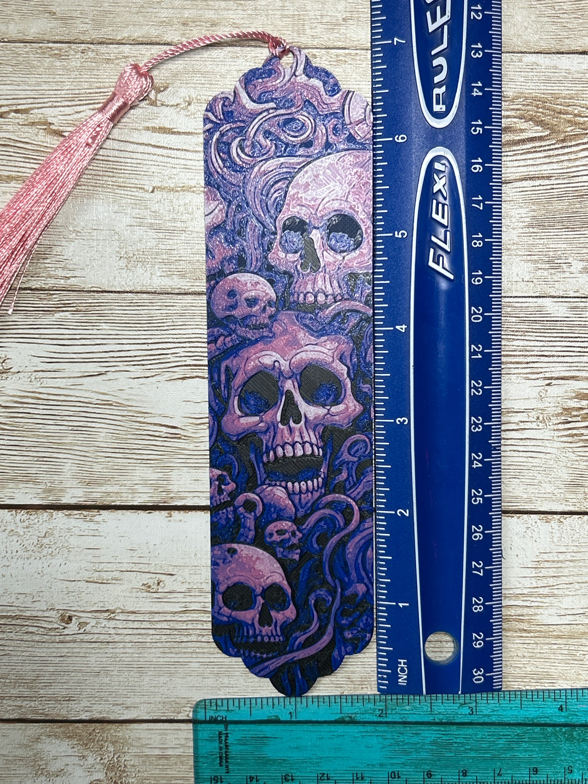 Bring a touch of spooky elegance to your reading with this 3D printed skull bookmark, featuring intricate filigree details in the background and a vibrant palette of purples and pinks. Perfect for fans of gothic-chic designs and Halloween-inspired accessories!